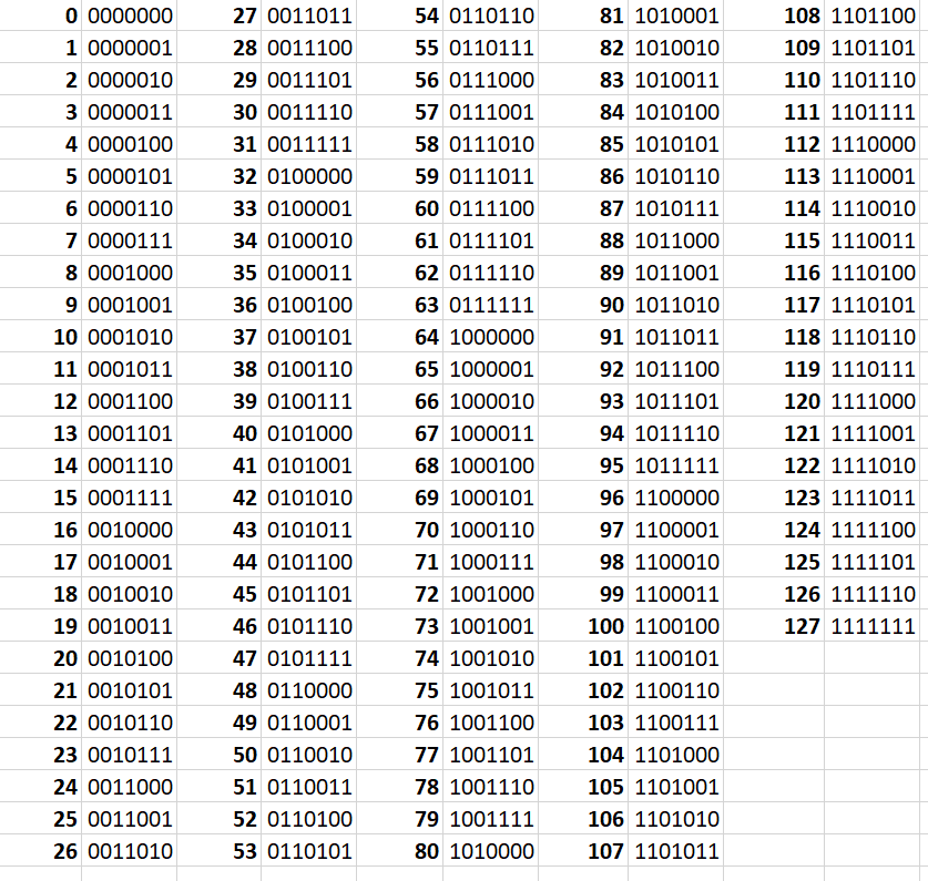 Dazu einfach aus der Tabelle die Nummer raussuchen und die binäre Zahl daneben so auf den kleinen weißen Schaltern einstellen, dass eine „1“ den Schalter nach oben darstellt und einen Null heißt Schalter nach unten. Es gelten die 7 rechten Schalter. Der allererste Schalter jedes Blocks wählt den MIDI-Kanal zwischen 1 und 2 aus. Schalter unten ist hier der MIDI-Kanal 1 und Schalter oben der MIDI-Kanal 2.